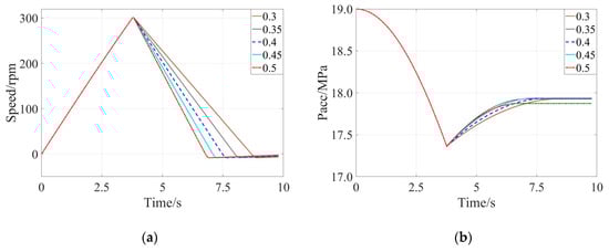 The initial braking speed ranged from 100 rpm to 300 rpm at an interval of 50 rpm when the braking intensity was kept at 0.4 and the initial pressure of the accumulator was set at 19 MPa. In this section, the obtained evolutions of speed of the flywheel and pressure of the accumulator were shown in Figure 7a,b, respectively, and the braking time, change of the kinetic energy, recycled energy amount, and the energy recovery rate with different initial pressure of the accumulator were calculated and summarized in Table 5. It could be found that improvement of the energy recovery rate was almost linear along with increase of the initial braking speed. Performance characteristics of the hydraulic accumulator indicated that efficiencies of the energy absorption and desorption of the hydraulic accumulator would be higher with a larger energy input, which meant that the hydraulic accumulator could recycle more braking energy when the initial braking speed was larger.