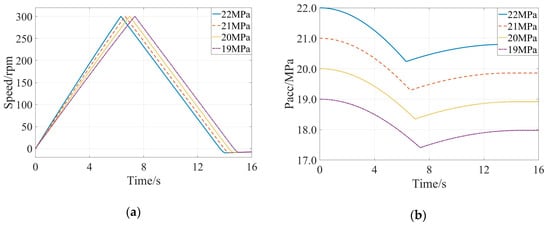 The initial pressure of the accumulator ranged from 19 MPa to 22 MPa at the interval of 1 MPa when the braking intensity was kept at 0.4 and the initial braking speed was set at 300 rpm. In this section, the obtained evolutions of speed of the flywheel and pressure of the accumulator were shown in Figure 6a,b, respectively, and the braking time, change of the kinetic energy, recycled energy amount, and the energy recovery rate with different initial pressure of the accumulator were calculated and summarized in Table 4. It could be observed, that effect of the initial pressure of the accumulator to the energy recovery rate was unobvious, and the energy recovery rate was slightly decreased along with increase of initial pressure of the accumulator. The reason for this phenomenon was that difficulty degree of the energy recovery was gradually increased along with increase of the initial pressure due to the performance characteristics of the accumulator, and stability of absorption and desorption of the accumulator indicated that change of the initial pressure would not affect the energy recovery rate significantly.