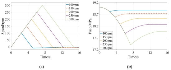 The braking intensity ranged from 0.3 to 0.5 at the interval of 0.05 when the initial pressure of the accumulator was kept as 19 MPa and the initial braking speed was kept as 300 rpm. Firstly, the accumulator was charged to 19 MPa. Secondly, the flywheel was separately driven to the speed of 300 rpm by the accumulator. The speed of 300 rpm of the flywheel was equivalent to the 120 km/h of the selected vehicle. Thirdly, the flywheel was braked with the different braking intensity of 0.3–0.5 at the interval of 0.05. The obtained evolutions of speed of the flywheel and those of pressure of the accumulator were shown in Figure 5a,b, respectively.