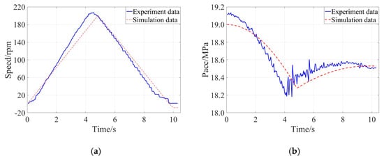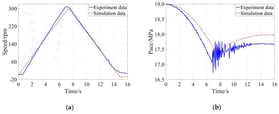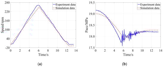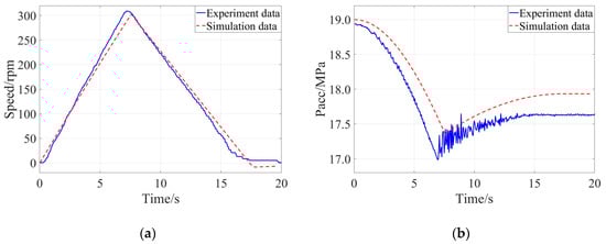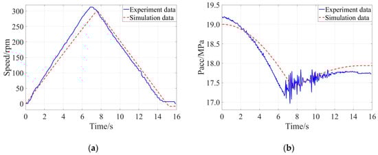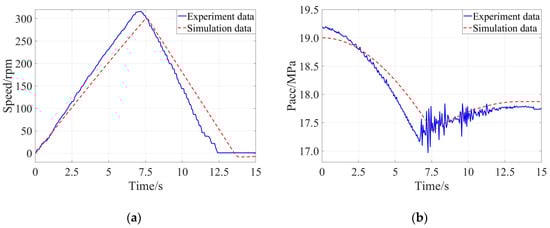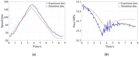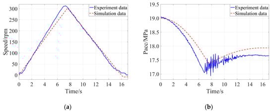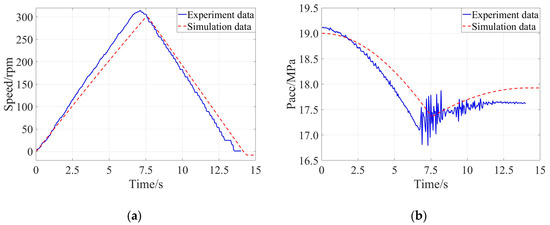 Comparison of the experimental result and simulation result when the braking intensity was 0.50: (a) Evolution of speed of the flywheel, (b) Evolution of pressure of the accumulator.