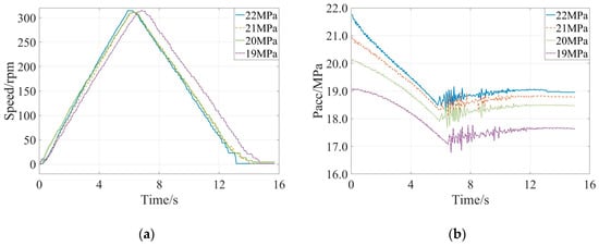 Experimental results with the different initial pressure of the accumulator: (a) Evolution of speed of the flywheel, (b) Evolution of pressure of the accumulator.