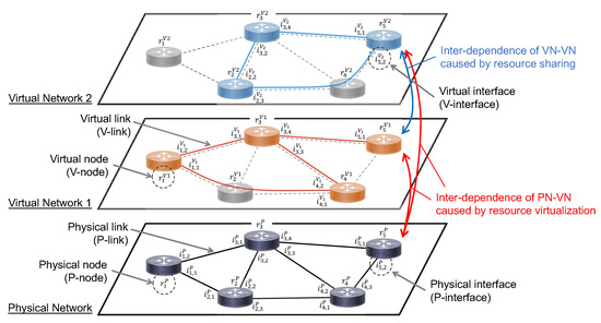 In this study, we assume an interdependent layered network where a single PN is virtualized by network slicing, and multiple VNs are constructed on the PN as shown in Figure 3. A PN comprises physical nodes (P-nodes) and physical links (P-links). Similarly, virtual nodes (V-nodes) and virtual links (V-links) form a VN. Because of the virtualization of the PN, each V-node corresponds to exactly one P-node, while a V-link comprises multiple P-nodes and P-links that realize the shortest path connecting the two endpoint V-nodes. We assume that the connectivity structure of the PN is given by the infrastructure provider, whereas each VN realizes its own connectivity based on the requests of the service provider. In Figure 3, the P-node and V-node in VN k with common index i are represented as and , respectively. The P-interface j of P-node i and the V-interface j of V-node i in VN k are represented as and , respectively. Refer to Table 2 for the description of the variables defined for the PV-NoN model and the evaluation in this paper.