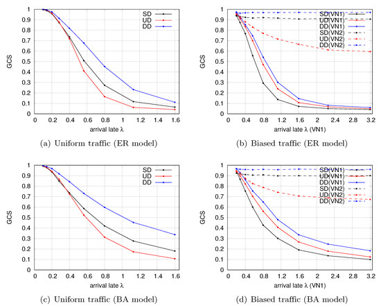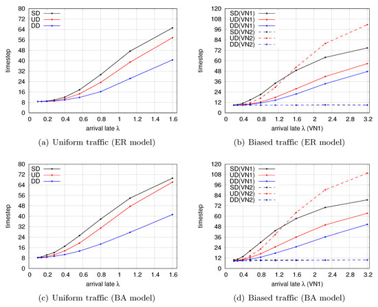 Another notable characteristic is observed in the simulation with biased traffic, as shown in Figure 4b,d. Because there is no resource partition among the VNs in type-UD, traffic congestion in one VN influences the other interdependent VNs in a cascading manner. Therefore, of the three dotted lines, only the red one drops as the arrival rate increases. The extent to which cascades occur with type-UD is expected to increase further if the overlapping area of physical resources shared among the VNs increases. Meanwhile, even though type-DD also shares the physical resources of P-interfaces, the cascading of the performance degradation is prevented by the complementary dependence inspired by the B-NoN model.
