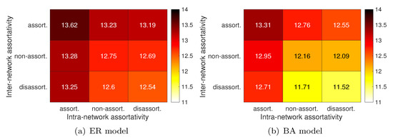 By contrast, Figure 7 shows that the packet-delay performance is increased when intranetwork connectivity is disassortative (i.e., ). When a network topology is formed assortatively, the network diameter becomes large and the communication performance degrades. It is true that assortative connectivity within each VN has a positive impact on availability, as seen in Figure 6. However, from a practical viewpoint of communication performance, we find that the increase of network diameter has a larger negative impact, resulting in degraded communication performance. As for the internetwork assortativity, the packet delay is decreased when it is disassortative, similar to the performance of GCS.
