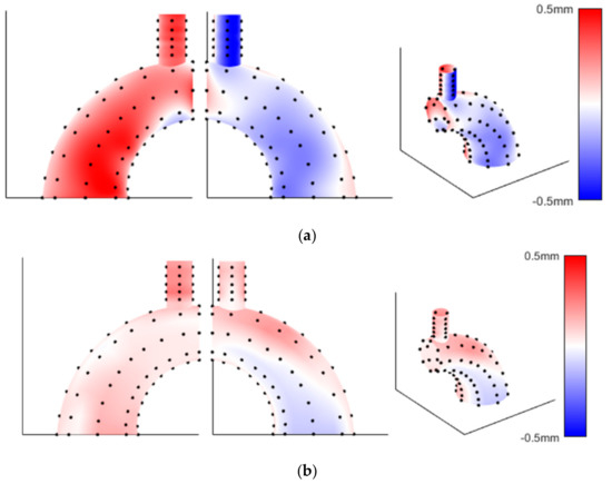 The second phantom had a more precise wall thickness than the initial phantom (Figure 7 and Figure 8). However, the initial phantom had a more accurate median wall thickness value. In particular, the second phantom was biased 0.1 mm too thick. When the phantoms’ final use in PIV analysis of haemodynamics and cardiovascular dysfunction is considered, it becomes apparent that precision is more important than accuracy. In particular, making the wall thickness 10% too large would change the apparent compliance by −10% (Equation (1)). However, the arterial behaviour would still be representative of haemodynamic flow as compliance can vary across individuals or disease states [49]. Since the goal of this study was to obtain generalizable haemodynamic behaviours in the ascending aortic arch, this level of wall-thickness precision may be considered acceptable. However, the level of precision required for accurate simulation of patient-specific haemodynamics is likely to be higher. To date, there have been no published and accepted standards of wall thickness precision when generating silicone phantoms for PIV analysis of haemodynamics.