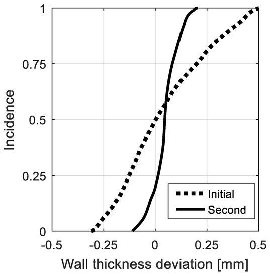 Distribution of wall thickness variation for the initial (a) and second (b) phantom. The intended wall thickness was 1 mm.