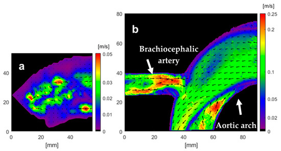 Indicative processed PIV images (a) initial phantom, (b); second phantom.
