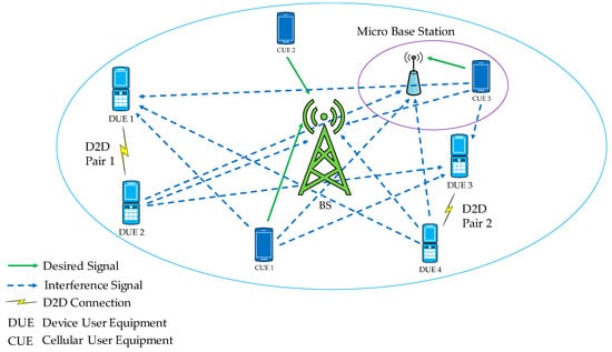 In order to study the most severe interference, it is assumed that all channel resources are occupied by macro cell users [22,23,24,25,26]. If a macro cell user can only occupy one channel, then . microcell users and D2D users respectively multiplex these channel resources. When the binary variables , and are 1, the macro cell user , the micro cell user and the D2D user use channel , otherwise 0.