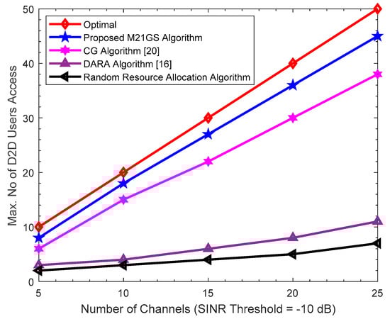 This section discusses the findings of the proposed study. As can be seen from the simulation results in Figure 2, Figure 3, Figure 4, Figure 5, Figure 6, Figure 7, Figure 8, Figure 9 and Figure 10, the proposed allocation algorithm gives better performance in terms of the mentioned parameters in those Figures as compared with the existing competing alternatives. As can be seen from Figure 2, when the number of channel allocations increases, the total system capacity of the existing algorithms in references [16,20] and RRA is much lower than the proposed algorithm. The capacity gap gets wider with an increasing number of channels which makes the proposed algorithm superior than them. It is also worth notable that the proposed scheme has closed performance with the optimal allocation scheme and this validates with the analytical formulation. In Figure 3, the access allocation to the number of D2D users versus the number of channels is compared for all the algorithms. It can be clearly seen from Figure 3 that as the number of channels allocation increases, the D2D users’ access of the proposed algorithm shows better performance than the existing reference algorithms and it also has close relation with the optimal scheme, verifying its effectiveness. The impact of the number of D2D user pairs on the capacity is illustrated in Figure 4. As can be seen from Figure 4 that as the number of D2D user pairs increase, the capacity of the proposed scheme shows a better increase than the existing algorithm, which makes it suitable for a large number of D2D users pairs scenarios. To elaborate on the effectiveness of the proposed allocation algorithm further, the total system capacity is analyzed against the SINR threshold in Figure 5. The results indicate that the capacity of the proposed M21GS scheme is better than reference [16,20] and random resource allocation schemes for any SINR threshold value. This means the proposed scheme gives stable and improved QoS under different SINR conditions. The impact of the number of iterations on the total system capacity and the average energy efficiency is assessed in Figure 6 and Figure 7. In Figure 6, when the number of channels is 10, the proposed algorithm converges at Iteration = 4 and gives 0.6 × 108 bps capacity. When the number of channels is 20, the proposed algorithm reaches its peak capacity of 1.25 × 108 bps at Iteration = 7. Finally, when the number of channels is 30, the proposed allocation algorithm reaches the peak capacity of 1.9 × 108 bps at Iteration =12. Such results give us important information about the impact of the number of iterations on the total system capacity. It means that for a higher system capacity requirement when the number of channels is increased, the number of iterations should also be increased to reach the peak capacity value. On the other hand, the existing algorithms require a large number of iterations to give the same capacity, which makes them unsuitable for the D2D communications. The impact of the number of iterations on energy efficiency is illustrated in Figure 7. The results indicate the effectiveness of the proposed algorithm over the existing algorithms. The energy efficiency of the proposed algorithm is almost independent of the number of iterations and stable at 58 Mbit/J which makes it robust against hardware impairments and channel limitations. On the other hand, the scheme in reference [20] reaches an energy efficiency of 50 Mbit/J at Iteration = 13. The algorithm in reference [16] requires MAXGEN= 10 to reach its peak energy efficiency of 43 Mbit/J, whereas the random resource allocation algorithm requires MAXGEN=15 to reach its peak energy efficiency of 33Mbit/J. By comparative assessment of both results in Figure 6 and Figure 7, the proposed scheme requires a smaller number of Iterations to provide an improved performance than the other competing alternatives. Therefore, system performance can be controlled to an optimal outcome by setting the number of Iterations to a particular required value. Figure 9 and Figure 10 further elaborate on the effectiveness of the proposed algorithm.
