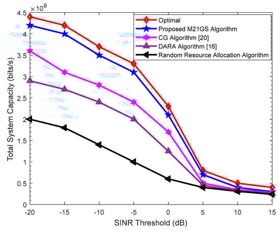 The simulation results in Figure 5 show the effect of the SINR threshold on the total system capacity. As can be seen from the figure, the total system capacity becomes smaller as the SINR threshold increases. When the SINR threshold exceeds 10 dB, the total system capacity does not change and reaches a minimum. This means that in order to guarantee the communication service quality of the cellular users, it is not allowed to allocate channel resources for D2D users to communicate, and only macro cellular users and micro cellular users can communicate. Furthermore, the results also indicate that the proposed M21GS algorithm gives better total system capacity for all values of SINR than CG [20], DARA [16] and Random Resource Allocation Algorithm and also has a close relation with optimal results.