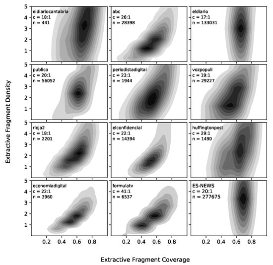 Figure 1 shows the density and coverage distributions along with the compression ratio for each newspaper in ES-NEWS corpus. Each box is a normalized bivariate density plot of Extractive Fragment Coverage (x-axis) and Extractive Fragment Density (y-axis) of a newspaper. Furthermore, the final distributions on full ES-NEWS is shown in the bottom-right box. As Figure 1 shows, the distribution of Extractive Fragment Density and Extractive Fragment Coverage of ES-NEWS is lead by ElDiario (coverage between 0.6 and 0.8 with a high density), due to that newspaper brings the largest number of articles to the corpus. Despite this, generally, the mean coverages and densities in the newspapers show that the introduction of new words in summaries and the use of long extractive fragments is moderate, although both are higher than in NEWSROOM corpus [].