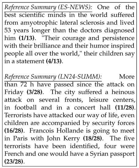 Examples of summaries from ES-NEWS and LN24-SUMM corpora translated from Spanish. The position of the most related sentence in the document, for each sentence of the summary, is highlighted in bold at the end of the sentences.