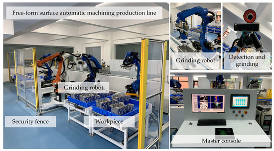 In many manufacturing fields, the processing of free-form surfaces is a challenging problem [1] (e.g., in aircraft engines, marine propellers, and sanitary equipment). In fact, poor working conditions have a negative impact on the health of workers. Robot grinding can reduce labor costs, reduce safety accidents, improve grinding quality, and work efficiency [2]. The free-form surface grinding robot (FFSGR) shown in Figure 1 was the result of a research project at the National Engineering Laboratory for robot visual perception and control. The FFSGR consisted of an industrial robot and its controller, an abrasive band, workpiece, and pens [3].