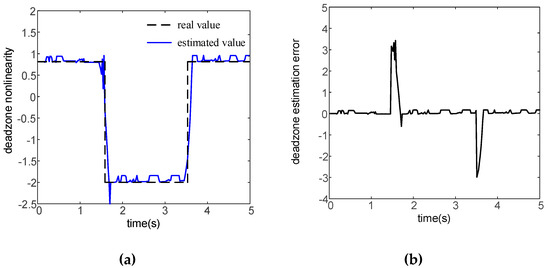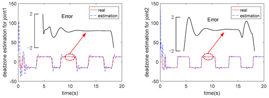 In the experiment, a limiter was applied to the output of the first joint controller to simulate the dead zone. The upper limit was 0.8, and the lower limit was −2. As can be seen from Figure 12, due to the fact of a certain delay, there was a large identification error at the moment of the upper and lower limit switching. When the system was in a steady state, the method based on the RBFNNs designed in this paper could identify the dead zone accurately. The peak value of the absolute value of the steady state error was 0.08.
