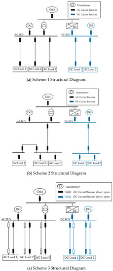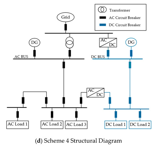 Taking the following four AC/DC hybrid microgrid schemes as examples, the comprehensive evaluation method of planning for AC/DC hybrid microgrid proposed in this paper is analyzed and calculated. The schematic structure of each scheme is shown in Figure 3. The parameters of each scheme are shown in Table 4.