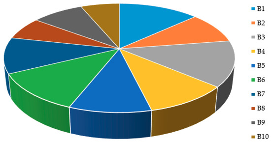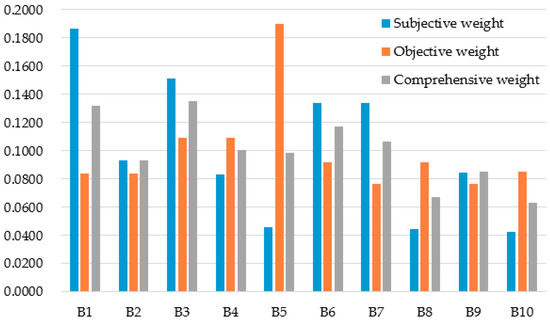 In Figure 4 and Table 5, we obtained the subjective weights of each index calculated by analytic hierarchy process. Among them, the subjective weights of B1, B3, B6, and B7 are larger, while the subjective weights of B5, B8, and B10 are smaller. In Figure 5 and Table 6, we obtained the objective weights of each index calculated by the method of entropy weight. Among them, the objective weights of B3, B4, and B5 are larger, while the objective weights of B1, B2, B7, and B9 are smaller. There are some differences between subjective weight and objective weight, which is caused by their different characteristics. Subjective methods are more inclined to people’s experience, while objective methods depend entirely on numerical values, so the results of the two methods will be different or even conflict.