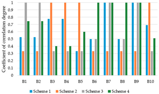 Based on the data in Table 6, we define the best scenario as x0 = [1,1,1,1,1,1,1,1,1,1]T. The correlation coefficients of four schemes under each index are obtained by Equation (25) as shown in Figure 8. Then the comprehensive weight and correlation coefficient calculated above are substituted into Equation (26) to calculate the correlation degree of the four schemes as shown in Table 8.