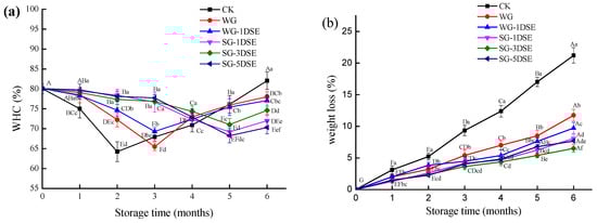 Changes of WHC (a) and weight loss (b) of CK, WG, WG-1DSE, SG-1DSE, SG-3DSE and SG-5DSE groups during frozen storage. Different lower case in different groups from same day indicates significant differences (p < 0.05). Different larger case in different groups from different day indicates significant differences (p < 0.05).