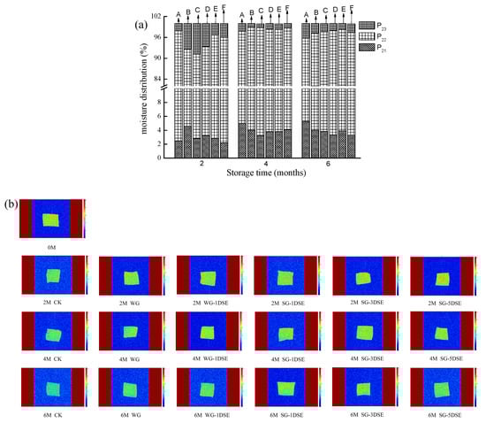 Relative content of three water component (a) and magnetic resonance imaging (MRI) (b) of CK(A), WG (B), WG-1DSE (C), SG-1DSE (D), SG-3DSE (E) and SG-5DSE (F) groups during frozen storage.