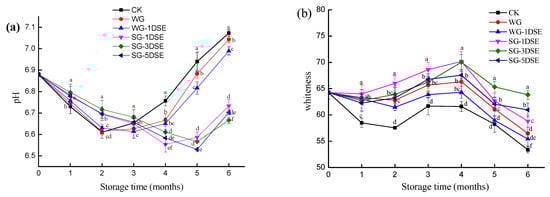 pH value (a) and whiteness (b) of CK, WG, WG-1DSE, SG-1DSE, SG-3DSEand SG-5DSE groups during frozen storage. Different lower case in different groups from same day indicates significant differences (p < 0.05).