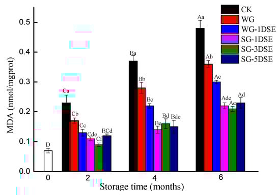 MDA values of CK, WG, WG-1DSE, SG-1DSE, SG-3DSE and SG-5DSE groups during frozen storage. Different lower case in different groups from same day indicates significant differences (p < 0.05). Different larger case in different groups from different day indicates significant differences (p < 0.05).