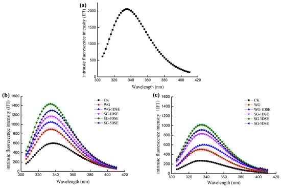 The intrinsic fluorescence intensity (IFI) of myofibrillar proteins of CK, WG, WG-1DSE, SG-1DSE, SG-3DSE and SG-5DSE groups in 0th (a), 3rd (b) and 6th (c) month.