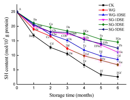 SH content of CK, WG, WG-1DSE, SG-1DSE, SG-3DSE and SG-5DSE groups during frozen storage. Different lower case in different groups from same day indicates significant differences (p < 0.05). Different larger case in different groups from different day indicates significant differences (p < 0.05).
