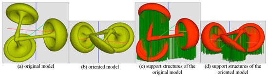 Orientation and support structure generation; (a) original model, (b) oriented model, (c) support structures (in green color) of the original model, and (d) support structures of the oriented model.