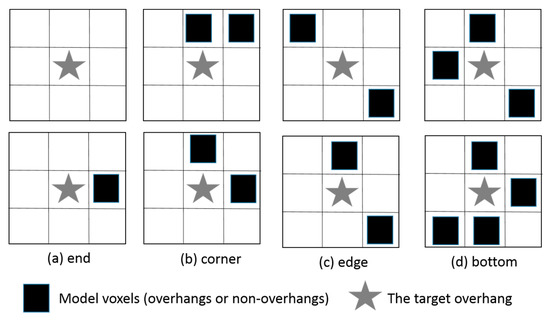 Classification patterns of overhangs: (a) end, (b) edge, (c) corner, and (d) bottom overhangs. The star represents the overhang to be classified, and the squares are its neighboring model voxels at the same layer. This figure shows only some representative patterns. Other patterns can be obtained by rotations or by analogy.
