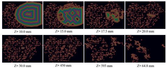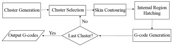 When a foreground voxel is eroded, its intensity is changed to a predefined value, dedicated to the skin region. Thus, the volume data set becomes a triple-valued 3D image after the skin region is generated. In the following computations, the input model is divided into slices along the z axis. The resultant slices are 2D images constituted by the void, skin, and internal pixels. The flowchart of converting a slice into G-codes is depicted in Figure 4. The skin and internal pixels may form several clusters in each individual slice, depending on the geometry of the input model. Thus, we have to group the foreground pixels into clusters by using a connected-component labelling scheme [26]. Then, these clusters are hatched one by one to generate toolpaths. As mentioned above, the skin and internal regions would be printed in different ways. Thus, the skin and internal pixels of each cluster will be rasterized by using different approaches. After the hatching process completes, the proposed slicer encodes the resultant toolpaths into G-codes and stores the G-codes in a disk file.