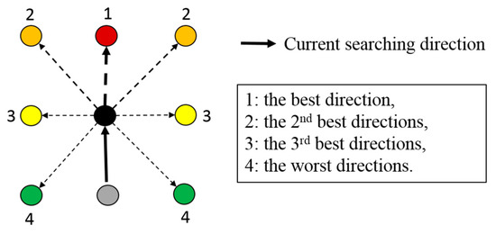 In the dfs, our slicer adopts a heuristic method to select marching directions to avoid generating short branches and staircases. The direction selection principle is illustrated in Figure 5. In the contour graph, a vertex has, at most, 8 neighbors. By ignoring the immediate predecessor in the dfs, our slicer has, at most, 7 directions to march forward from the current vertex. The direction from the immediate predecessor to the current vertex is regarded as the best direction to move forward, since it produces a straight path. If no vertex exists in this direction, our slicer examines the two adjacent directions. If any one of these two directions leads to an unvisited neighbor, the dfs continues in this direction such that the turning angle is minimized. Otherwise, the next two unvisited directions, adjacent to the previously examined two directions, are investigated. By following this principle, the searching process repeats until a direction is found or all the 7 directions have been tried. If forward-marching is impossible, our slicer backtracks to a vertex, in which a new branch can be grown, and starts to integrate a new branch from there.
