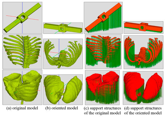 Images of the stick, bone, and lung models; (a) the raw models, (b) oriented models, (c) support structures of the raw models, and (d) support structures of the oriented models.