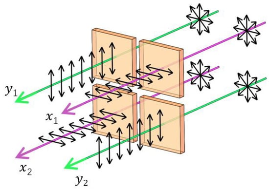 After being reflected by the single mirror and the four-sided mirror, each image passes through the corresponding aperture stop and polarizer, and is imaged onto the image surface by the same lens. The four aperture stops are spatially offset from each other, and a polarizer is placed in front of each aperture stop. The polarization directions of each beam, passing through four polarizers, are illustrated in Figure 2. After passing through the polarizers, the polarizing directions of imaging beams x1 and x2 are the same, and the polarization directions of the imaging beams y1 and y2 are perpendicular to those of beams x1 and x2. Therefore, imaging beam x1 interferes with x2, and imaging beam y1 interferes with y2. No cross interference occurs between the two pairs of beams.