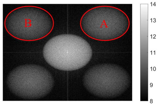 Figure 7 shows the spectrum distribution of the speckle pattern image after Fourier transformation, which is similar to that obtained theoretically as illustrated in Figure 4. The spectrum shown in Figure 7 is the logarithm of the original spectral intensity to make the figure clearer. The different terms, schematically presented in Figure 4, can be clearly separated in Figure 7. The two terms marked by a red circle and labeled with A and B are corresponding to , and , respectively. According to Equation (3) and Figure 4, the lower terms should be the conjugate of the upper ones. The negative displacement would be determined form the lower terms.