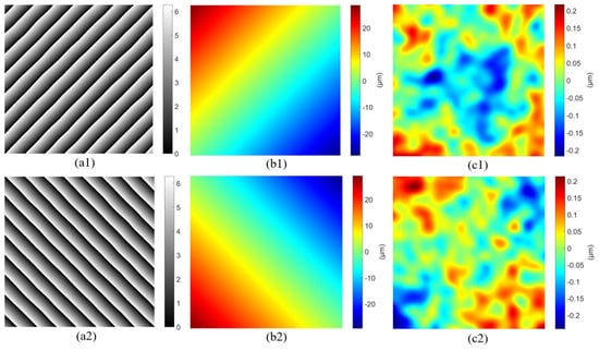 Generally speaking, the measurement accuracy and sensitivity of DSPI are mainly determined by the phase map quality and number of times the images are smoothed. Speckle interference is usually able to reach a measuring sensitivity of about 2π/20 to 2π/10 (2π corresponds one fringe) and a measuring accuracy of about 2π/5 to 2π/2. A detailed discussion regarding this topic can be found in reference [33]. In this research, the in-plane displacement is produced by the rigid-body rotation, which follows certain rules demonstrated by Sijin Wu [7]. The displacement reference value is obtained by fitting the measured in-plane displacements according to the rules. Then, the errors of the measured displacements, relative to the reference value are calculated, as shown in Figure 8(c1,c2). The root-mean-square (RMS) errors of in-plane displacements in the x-axis direction and y-axis direction are 0.071 μm, and 0.072 μm respectively, which exhibits high accuracy.