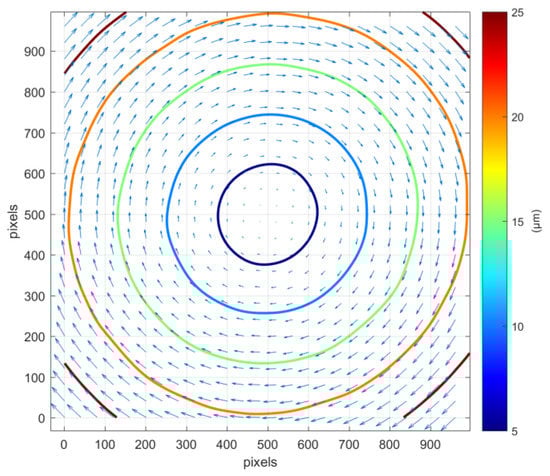 Because the displacement, shown in Figure 8, is produced by an in-plane rotation, the contours of the absolute in-plane displacement are essentially a set of concentric circles around the rotation center. The synthetic in-plane displacement vectors are illustrated in Figure 9, with the contours of the absolute in-plane displacement. The vectors are tangent to the corresponding displacement contours, satisfying the law of displacement introduced by rigid body rotation. The direction of rotation can be easily distinguished from the directions of the in-plane displacement vectors.