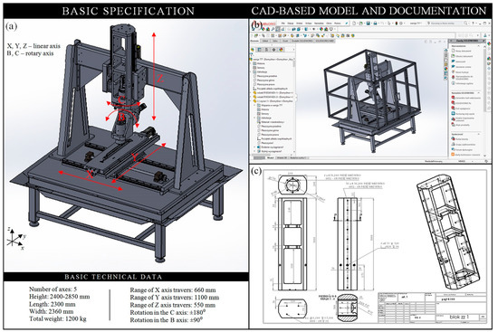 Design phase of a 5-axis CNC grinding machine for the precision grinding process of the cutting edges of industrial cutting blades: (a) Computer model of the CNC technological machine with kinematics of individual axes; (b) CAD-based model developed in a Solid Works environment; (c) an example of an executive drawing of the technological machine body.