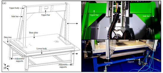 The main element of the 5-axis CNC grinding machine was a high-stiffness lower body, constituting the basis for the whole technological machine. It was made of cold-bent hard-walled profiles in a truss shape with dimensions 120 × 120 × 6 mm which, after the welding process, was subjected to a stress annealed treatment. The bottom part of the lower body was equipped with adjustable supports, enabling the proper leveling of the technological machine. In addition, the body was equipped with a drip tray for efficient collection and discharge of the coolant fed in the grinding process. An intermediate element between the frame and the further parts of the technological machine was an aluminum plate, attached to the bottom part of the frame and constituting the assembly base for subsequent components/units of the machine. The lower body had a structure consisting of two side bars and one upper bar twisted together into one compact whole in the form of a gate, for ensuring high-stiffness during operation. Such a construction, forming the upper body, was an extremely important element of the 5-axis CNC grinding machine, necessary for the correct vertical operation of the Z linear axis and the accompanying B and C rotary axes, respectively. The upper body was produced of high-quality sheet metal with thickness t = 12 mm, shaped in the bending process to obtain a sufficiently high-stiffness and to provide adequate parameters of vibration damping and high thermal resistance. All elements, after the welding process, were annealed in order to eliminate internal stresses, and then machining of the base elements was performed. Additionally, in order to ensure proper work safety, a protective cage made of aluminum profiles and plates made of transparent polycarbonate (PC) with a thickness t = 15 mm was used. In the front part, it was equipped with a servicing door. An axonometric view of the three-dimensional (3D) model of the lower and upper body and detailed views of its construction are presented in Figure 2.