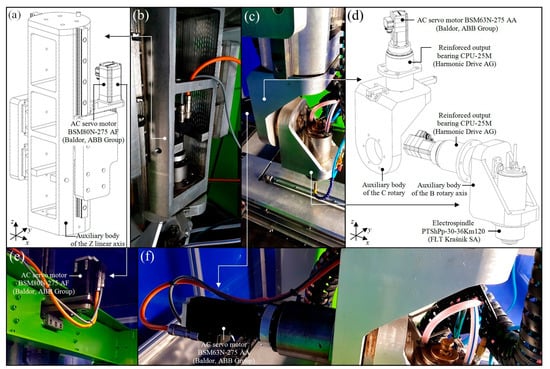 Construction phase of a 5-axis CNC grinding machine for the precision grinding process of the cutting edges of industrial cutting blades: (a,b) Auxiliary body of the Z linear axis (axonometric view of the 3D model and construction details); (c,d) auxiliary bodies of the C and B rotary axes, respectively (axonometric views of the 3D models and construction details); (e) details of AC servo motor BSM80N-275 AF mounting in of the Z linear axis; (f) details of AC servo motor BSM63N-275 AA mounting in of the B rotary axis.