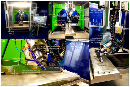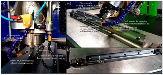 Construction phase of a 5-axis CNC grinding machine for the precision grinding process of the cutting edges of industrial cutting blades: (a) Cooling–lubricating system based on the minimum quantity lubrication (MQL) method, using nozzle MQL for supplying oil mist by compressed air; (b) cooling–lubricating system based on the cold air gun (CAG) method, using nozzle CAG for supplying low-temperature compressed air; (c) fixing grip with mounted industrial cutting blade during regeneration process; (d) details of fixing grip.