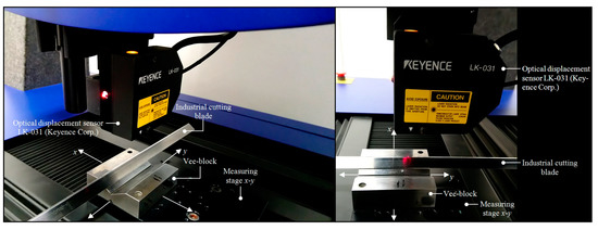 After the end of the abrasive processing, all industrial cutting blades were subjected to high-accuracy 3D optical measurements in order to assess the influence of the preset machining parameters of the expected cutting edge surface texture. In the measurements, a multisensory optical profilometer Talysurf CLI 2000 (Taylor-Hobson Ltd., Leicester, Great Britain) equipped with LK-031 optical displacement sensor (λ = 670 nm, P = 0.95 mW, ds ~ 30 mm, r = 1 µm) and LK-2001 controller (Keyence Corp., Osaka, Japan) was used. Detailed characteristics of this instrument were presented in the work [26], whereas its view during measurements is shown in Figure 7.