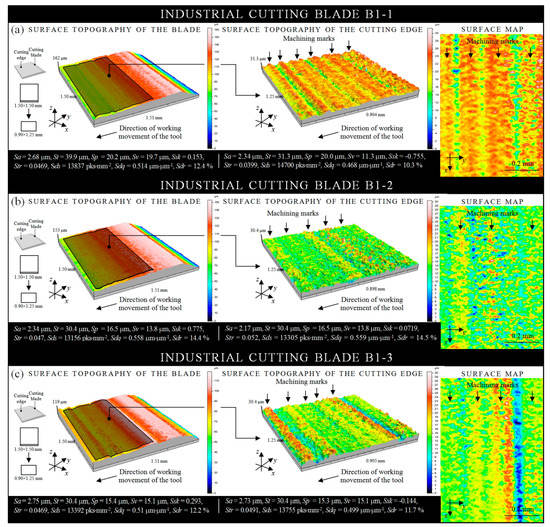 The collection of results of the measurements obtained by the use of multisensory optical profilometer Taylor-Hobson Talysurf CLI 2000 for a surfaces of three low-stiffness planar industrial cutting blades regenerated by the peripheral grinding process (vw = 300–400 mm/min, ns = 38,000 min−1) realized in a 5-axis CNC grinding machine is presented in Figure 8. The analysis of the above results allows to state that for all regenerated surfaces of cutting edges, one can observe clear machining marks characteristic of the grinding process. Marks, perpendicular to the working movement direction of the cutting edges, were shaped more or less regularly with similar spacing. Their height (given by St amplitude parameter) was in a level ~15–16 μm (samples B1-1 and B1-3—Figure 8a,c, respectively) and ~5–6 μm (sample B1-2—Figure 8b). A comparison of the results of the analyses, presented in graphical form with the values of surface texture parameters, is listed in Figure 10a–c (top). It can be noticed that for the cutting edge of sample B1-2, the lowest values were obtained (Sa = 2.17 μm, St = 30.4 μm, and Str = 0.03 μm). The Sds spatial parameter was also characterized by lower values, whereas for two hybrid parameters (Sdr and Sdq), higher values were obtained. The sign of the Ssk amplitude parameter indicated the predominance of peaks comprising the surface. In regard to the above, the sample B1-2 can be considered as regenerated in the most appropriate way from those presented in Figure 8. Nevertheless, the geometry of the surface has not been fully reproduced correctly, which forced to change the kinematics of the grinding process. Subsequent tests were carried out using front grinding.