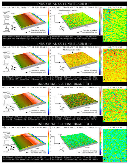 The measurements methodology included 1.50 × 1.50 mm measurements of the topographies of the selected surface fragment of each of the industrial cutting blade for conditions given in Table 5. After the measurement, the saved *.SUR file with measurement data was opened in specialized TalyMap Silver ver. 4.1.2 (Digital Surf, Besançon, France) software. Before starting the proper analyses, the measurement data were leveled and (if necessary) non-measured points were filled out. A proper analysis was carried out on the basis of a surface map in indexed colors (where the height of the surface elements was encoded with the color), and topography of measured surface and calculated values of selected parameters from the amplitude, spatial, and hybrid groups is given in Table 6. Additionally, from 1.50 × 1.50 mm surface topography, a fragment, which presented area of cutting blade, was extracted. In this way, a 0.90 × 1.25 mm surface topography was obtained. After filtering out waviness, for such surface topography, the software calculated selected parameters.