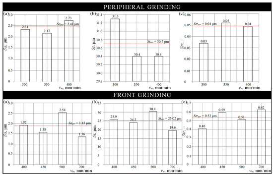 Collection of results in the form of bar graphs, representing values of essential surface texture parameters calculated in TalyMap Silver ver. 4.1.2 software, for the cutting edges of industrial cutting blades regenerated by the use of a 5-axis CNC grinding machine in a peripheral grinding process (top): (a) Sa; (b) St; (c) Str, and front grinding process (bottom): (a) Sa; (b) St; (c) Str.