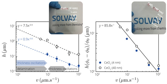 (Left): Thickness of coatings of nanoparticles deposited at different coating speeds v; each point averages at least seven independent experiments. The different morphologies of the sample are zoned at the bottom left for the two systems (blue 4 nm, grey 40 nm) and flat films are obtained otherwise, see Figure 2 top; the dashed lines represent the fitting with a power law. (Right): Rescaled data considering the initial volume fraction and a dry volume fraction . The solid line is a fit according to Equation (3). Inserts: Macroscopic views of the samples highlighting the high degree of transparency.