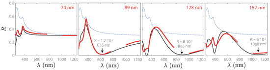 We performed the characterization of intensity reflectance R under normal incidence of light in the range nm with bench-top, fairly basic equipment; the main limitation of our set-up comes from the illumination and collection of optical fibres which do not work exactly at normal incidence but accommodate some angular opening, which is somewhat detrimental to the fine measurement of R. Figure 5 shows measurements of R vs when the coating is deposited on the polished side of a silicon wafer. Here, we show the results for coatings with four different thickness (red curves) along with the reference reflectance of the bare silicon substrate (blue dashed curve) and the calculated reflectance, black curve with Equation (1).