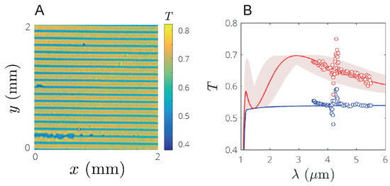 (A) Imaging the intensity transmission T at m for a micro-structured pattern. (B) Spectral transmission T in the mid-IR range. Symbols are the local average of the wavelength dependent transmittance for the bare silicon substrate (blue) and for the pattern (red, average along the bright lines). The solid blue line is the theoretical transmission of an incoherent silicon substrate; the solid red line corresponds to a calculated T with a coating thickness nm, whereas the pale red zone shows the parametrization of T with h ranging from 300 to 600 nm.