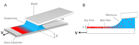 Sketch of the convective self-assembly (CSA) set-up: (A) A small volume of a dispersion of nanoparticles (the ‘reservoir’, in blue) is placed in-between a static blade and a substrate moving at controlled velocity v. (B) Side view of the geometry which leads to a deposit, in red, of controllable thickness h drying soon at the level of the meniscus [7,8]. The figures were reprinted with permission from Langmuir 2016, 32, 51, 13657–13668. Copyright 2016 American Chemical Society.