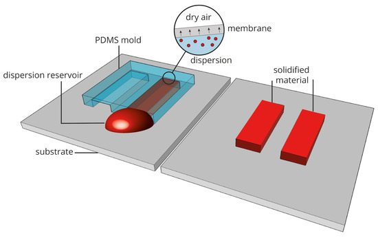 Sketch of the -pervaporation technique leading to micro-structured deposits: A poly(dimethyl siloxane) (PDMS) mould (left) is designed with channels initially filled with a dilute dispersion; solvent spontaneously permeates across the elastomer, concentrates the nanoparticles, and leads to a solid material out of the dispersion upon removal of the mould (right).