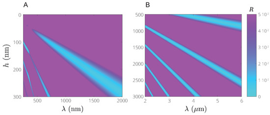 Reflectance R calculated for a nanoporous coatings of variable thickness h deposited on a silicon substrate. (A): Small thickness h in the visible and near-IR range; (B): Large thickness in the mid-IR range.